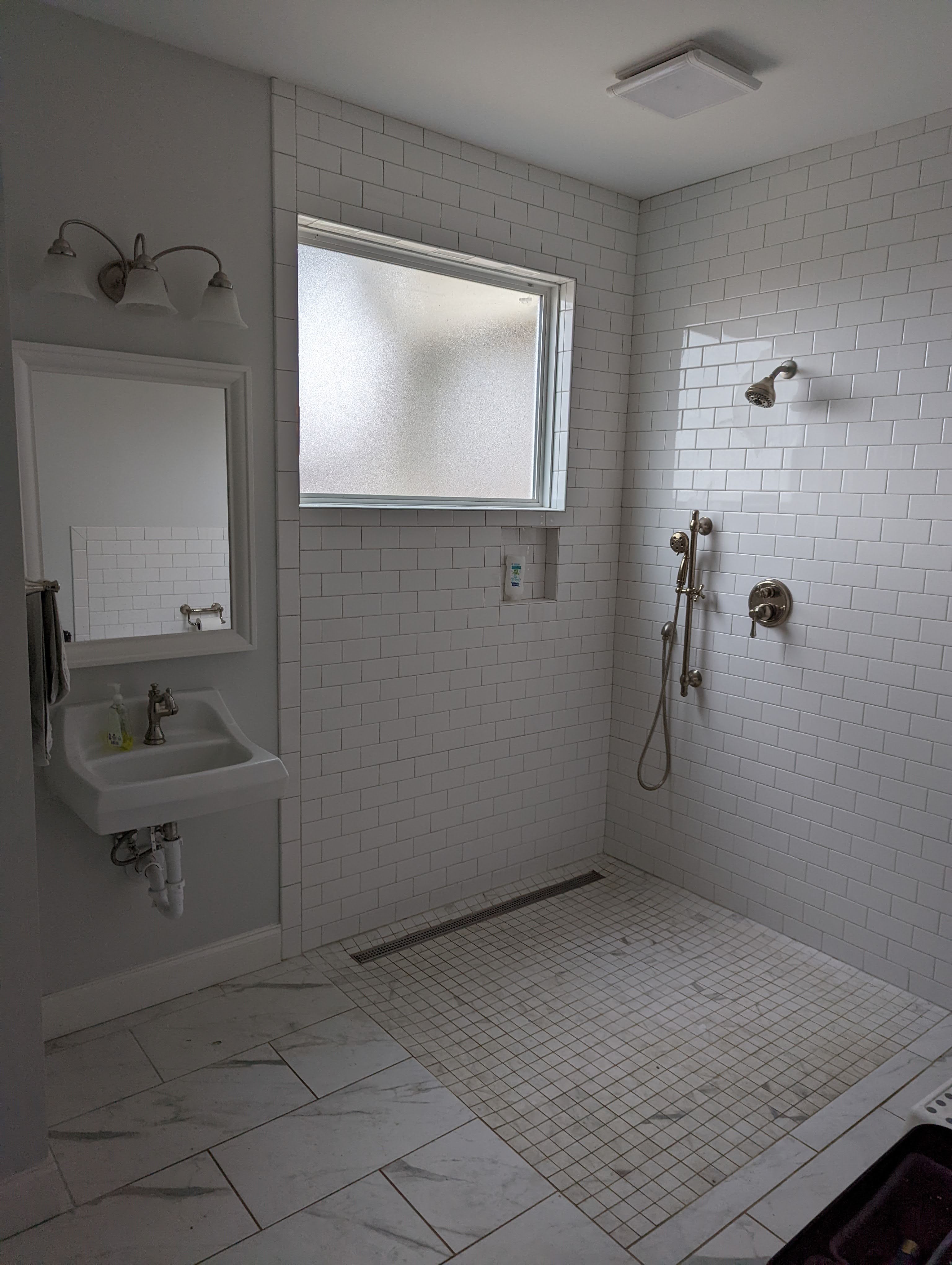 The children’s bathroom was made to be 100% barrier free to normalize accommodation for future needs before they became necessary. The owners elected to skip a tub in favor of a large shower with a trench drain and a handheld sprayer. This was left open to the toilet, which was equipped with a nearby power receptacle for a bidet. The vanity was a simple wall mounted ADA sink to allow easy wheelchair access.